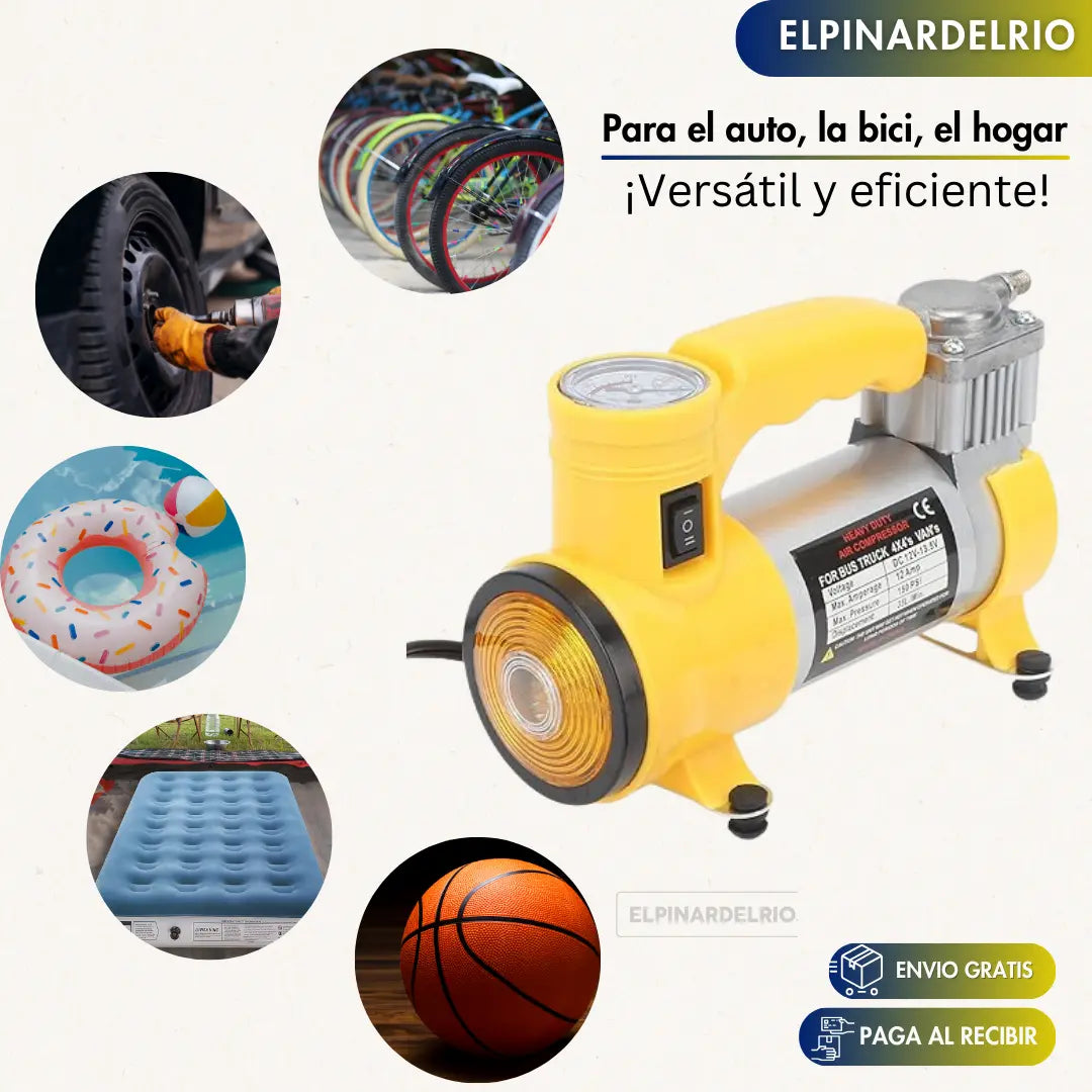 Solución portátil, rápida y confiable para inflar neumáticos, colchones, bicicletas y más.